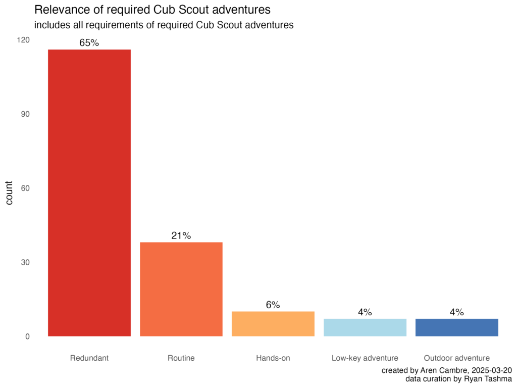 Also, in watering down Cub Scout advancement, the National Cub Scout Committee largely divorced its program’s essentials from adventure: