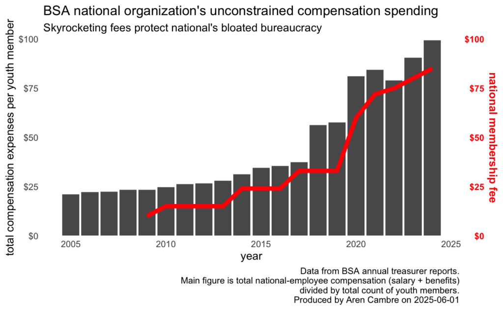 The movement often comes across as an inconvenience that commissioned bureaucrats have to deal with. We see this today with open hostility toward the movement over matters that have no merit except to maintain salary lines for bureaucrats, such as allowing councils to impose bureaucracy-preservation fees, maintaining far too many councils on the roster (inflates job roles for senior bureaucrats), or skyrocketing member fees that track skyrocketing, per-youth-member salary spend:
